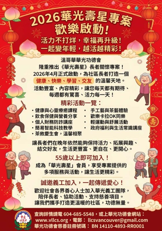 The Lotus Light Charity Society (Vancouver) is delighted to launch the 2026 “Lotus Light Longevity Star – Senior Care Project.”